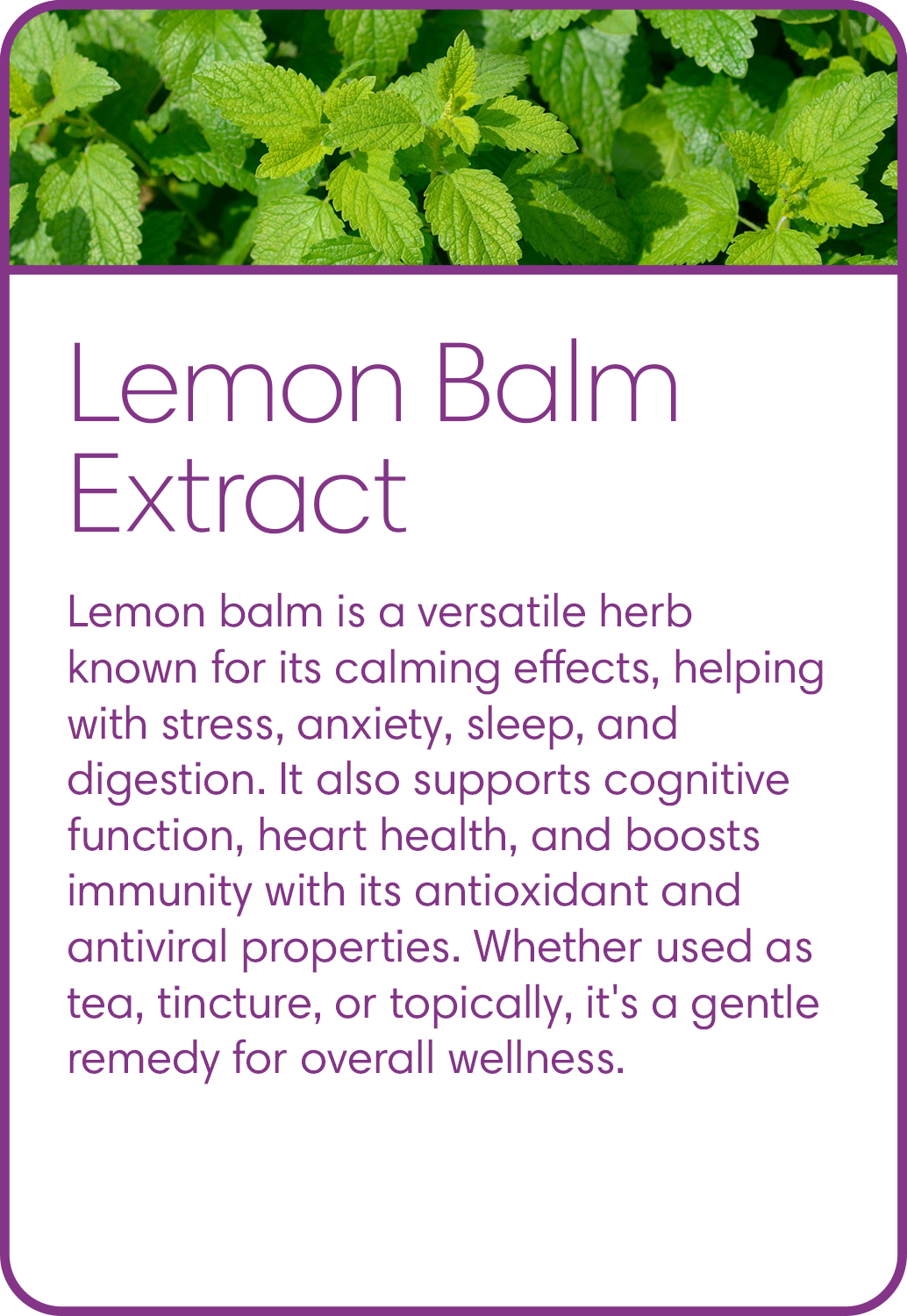 - Relaxation Support: The calming power of Lemon Balm, Valerian Root, and L-theanine soothes your mind and prepares your body for rest.
